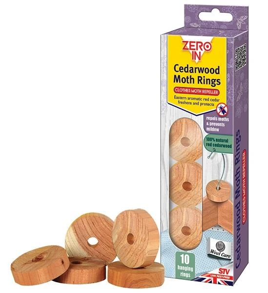 Cedar wood Clothes Moth Rings are effective at repelling adult moths and their larvae. The rings have a hole in the centre for placing on a hanger. This product is 100% natural, and gives off a pleasant fragrance. Can be refreshed by rubbing with fine sand paper.