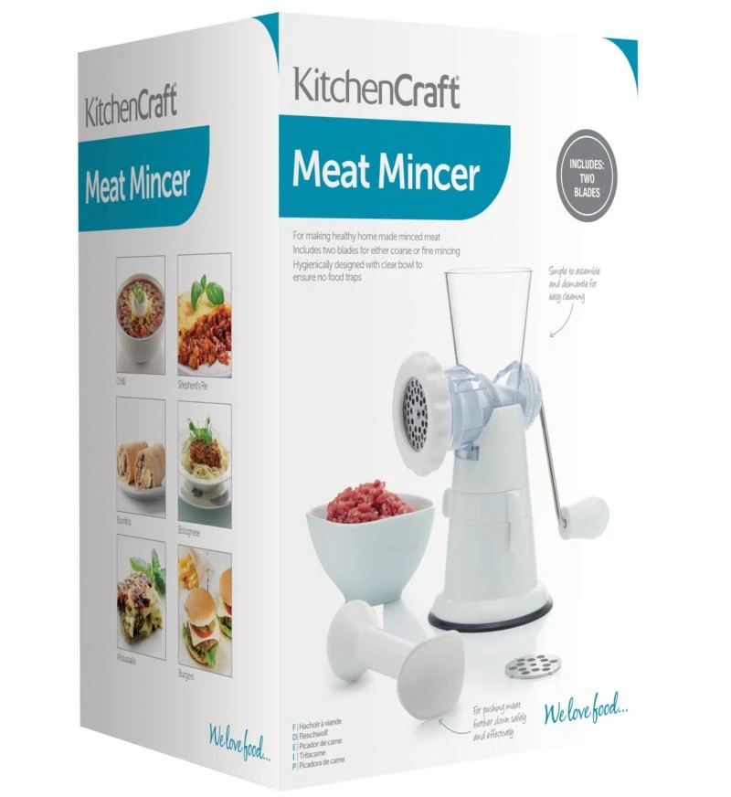 Kitchen Craft Suction Base Mincer is great for making healthy home made minced meat. Made from plastic, this mincer comes with durable coarse and fine mincing blades, and a plastic pusher to push meat further down the top funnel.